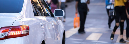 Back view of white car parked on city pedestrian zone on background of blurred silhouettes of people walking along green sunny summer alley. Modern city lifestyle concept.