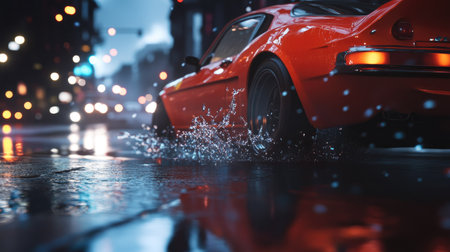 Car on a wet urban road during a rain shower, with water splashing from the wheels, and streetlights reflecting on the road