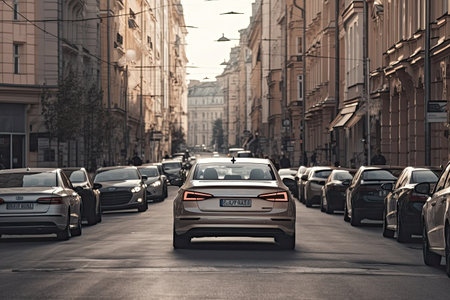 The car is parked on the side of the road at sunset. The concept of transport parking in a big city. AI generated.