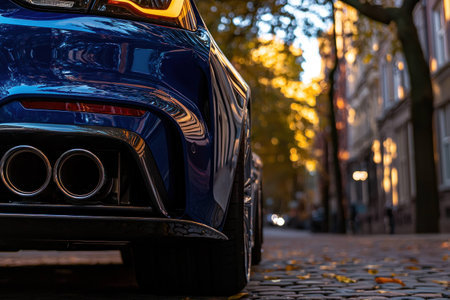Stunning blue sports car parked on a cobblestone street, showcasing its sleek design and vibrant autumn colors in the background, evoking a sense of luxury and adventure