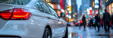 White Car Reflecting City Lights on a Rainy Evening, with Blurred People in the Background