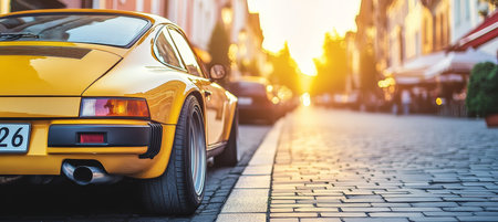 Classic Yellow Sports Car Parked on a Cobblestone Street in a Picturesque European Town at Sunset