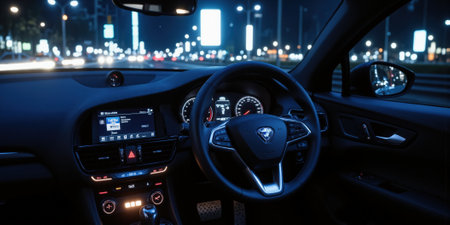 A close-up of a cars dashboard at night, illuminated by the soft glow of the instrument panel, showcasing the intricate design and advanced