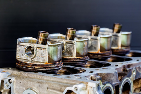 New pistons and cylinder head of engine block vehicle. Motor capital repair. Sixteen valve and four cylinder. Car service concept. The job of a mechanic. Old and new pistons.