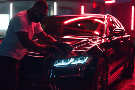 A man wiping down a shiny sleek car with a cloth, AI-generated.
