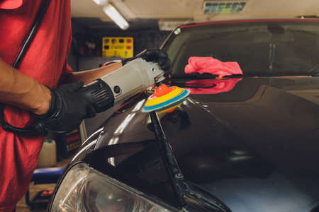 professional mechanic using a power buffer machine for cleaning the body of a car from scratches. Detail of car care concept