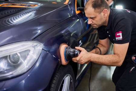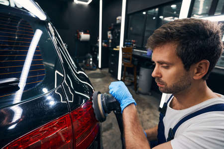Car detailing - Man with orbital polisher in repair shop polishing car. Selective focus.