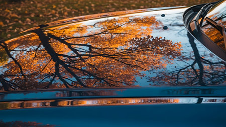 Autumnal reflection on a car's surface.
