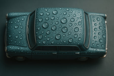 Miniature Car Roof Covered In Raindrops With Wet Surface Texture In Moody Light