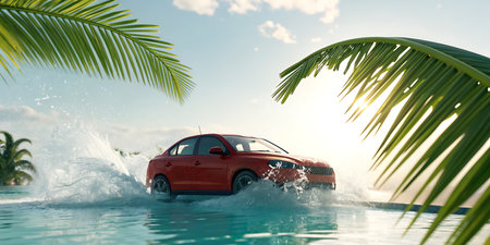 Car splashing in swimming pool with palm leaves. 3d rendering