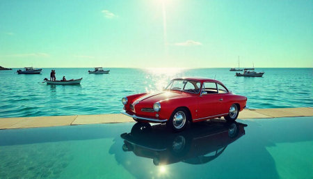 Red classic car by the sea with turquoise water