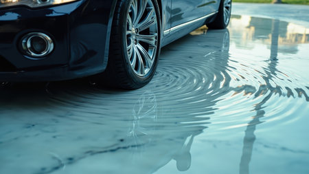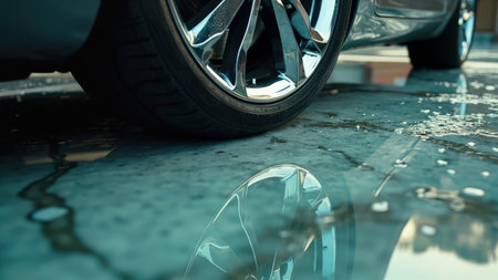 Chrome car wheel reflecting in water on a wet concrete surface with tire and vehicle body details.