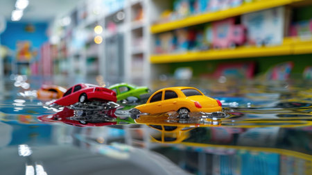 A vibrant scene depicting colorful toy cars floating on water inside a playful store, creating an imaginative and whimsical atmosphere for children.