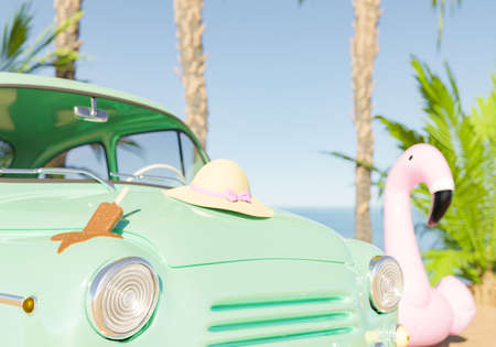 3D illustration of green retro vehicle with straw hat and melted ice cream on hood parked near flamingo tube and tropical palms on beach against blue sky and sea
