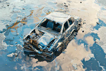 Dramatic scene of a car accident vehicle submerged in a lake surrounded by scenic nature