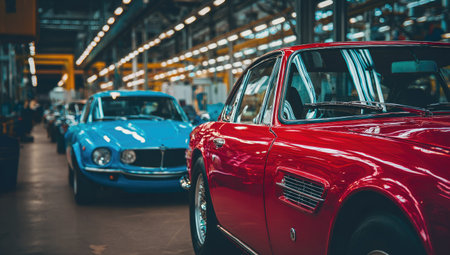 A close-up view presents a vibrant red classic car, while a blue car is seen further back. The scene showcases vintage vehicles arranged in an industrial environment, enhanced by artificial lighting. This image could be used for various commercial projects related to automotive or historical themes.