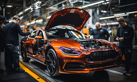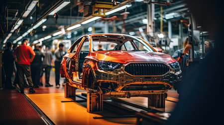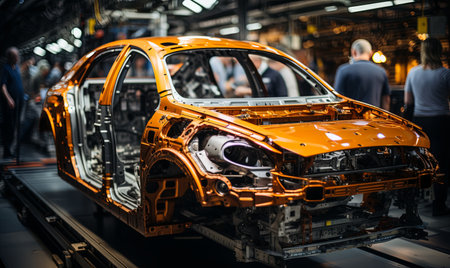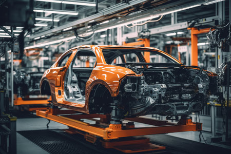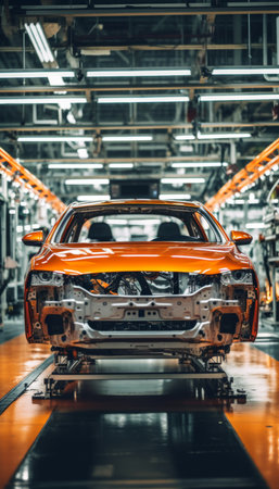 Orange car on production line with detailed frame and components in modern factory setting