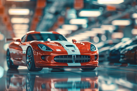 A close-up shot of a sleek orange sports car under showroom lighting, showcasing its modern design and elegance.