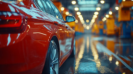 Close-up view of a shiny red car inside an industrial auto service center with bright lighting.