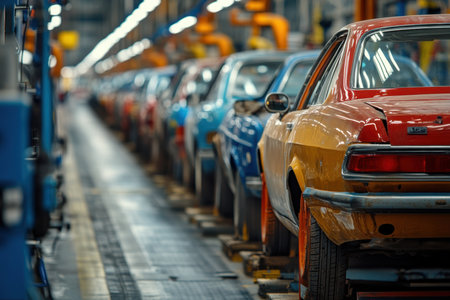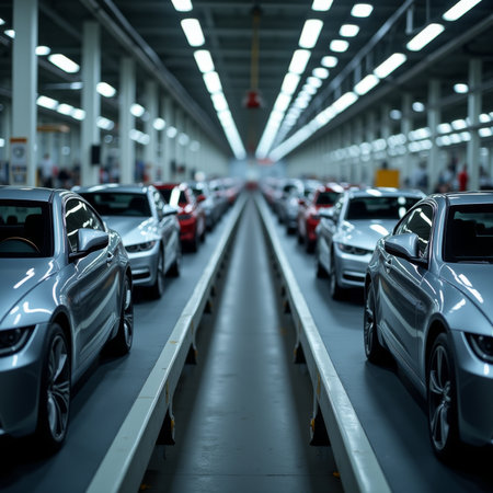 An organized automobile manufacturing facility filled with vehicles in various stages of assembly under bright factory lights during daytime hours