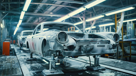 Automobile undergoing assembly in a modern factory, representing industrial car manufacturing and production efficiency.