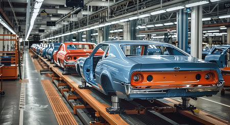 An unfinished classic car body sits on the assembly line, surrounded by modern industrial automotive plant equipment
