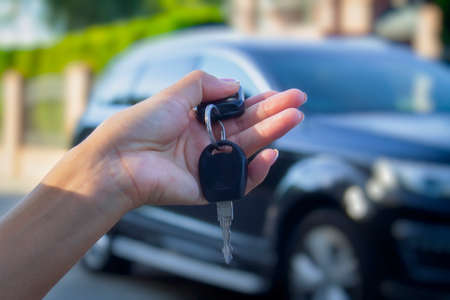 A person holding a car key, a female car rental company employee is about to deliver the car to a customer who has signed a rental contract and paid the deposit. Car rental concept.