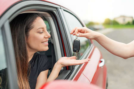 An attractive woman in a car gets the car keys.