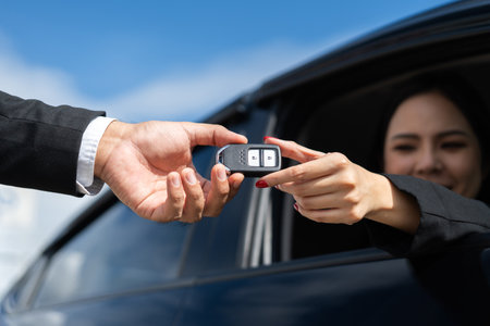 Young asian businesswoman buying new car with sale manager. she getting key and go to driving car very happy and proud. Buy sell rent concept. Hand sending key vehicle contract business car deal