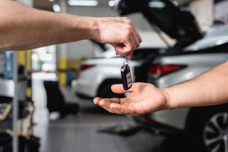 close up of customer hand giving car keys to mechanic