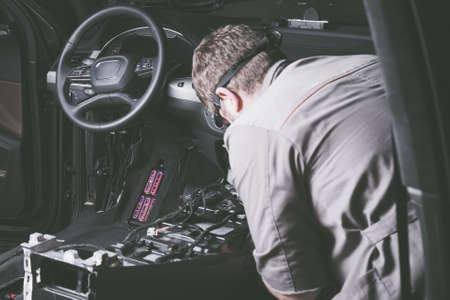 A mechanic work, repairs a luxury SUV Repair wiring, gearboxes, disassembled interior premium crossover. Removed chairs. Leather interior. Neat repair service center.