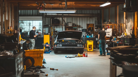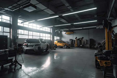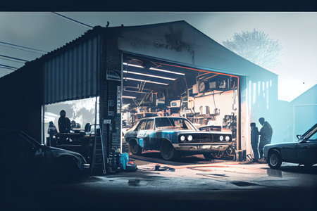 double-exposure of busy automotive repair shop with cars in different stages of repair, created with generative ai