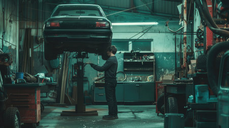 The mechanic inspects the underside of a lifted car in a busy garage, surrounded by tools and equipment during the late afternoon.