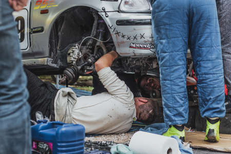 Skradin, Croatia, June 2020 Mechanics under a dissasembled front of the car, working on the racecar before a hillclimb. Parked in the paddock, hectic race environment