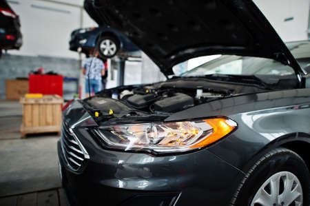 Car repair and maintenance theme. Car open hood engine in auto service.