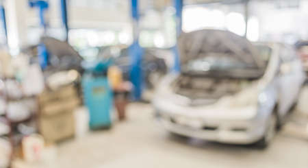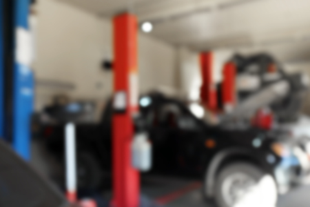 Auto repair workshop interior in bokeh, blurred defocused background. Car on lift in mechanic shop or garage, vehicles inside maintenance, workplace and business - small service station.
