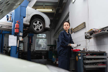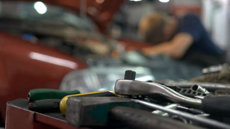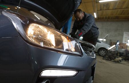Mechanic in car service fixing and repairing detail of automobile, defocused background