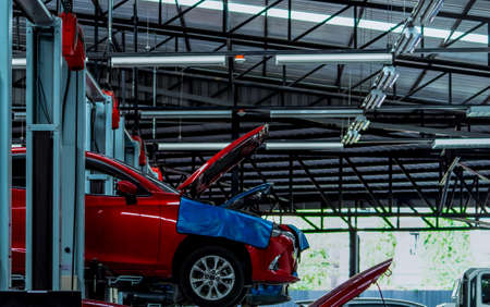 Auto repair shop. Red SUV car is lift in garage for repair and maintenance service. Auto service with lifted vehicle. Car body lifted in workshop for inspection. Car check up at service station.