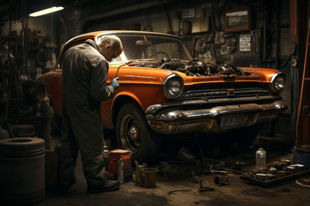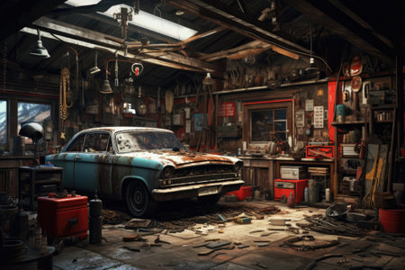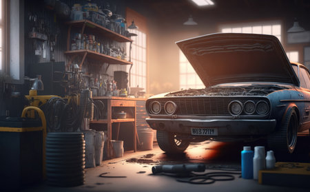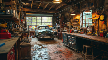 Vintage car restoration, cluttered workbenches, tools on pegboard, mechanic's haven, detailed garage workshop scene Generative AI