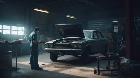 Old car in the garage. Old car in an old garage, Automotive repair shop, AI Generated