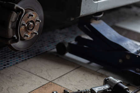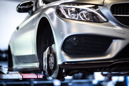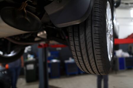 Close-up view of car wheel. Automobile on mechanical lift. Car service station and machine maintenance concept. Macro shot of auto components in repair garage