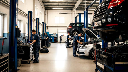 In a busy car repair shop, several vehicles such as a red car and a blue sedan are positioned under bright lights. Workers are engaged in maintenance tasks at various workstations.
