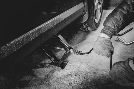 Male hands in dirty gloves, twist the handle of the jack and raise the car to change tires. Black and white photo