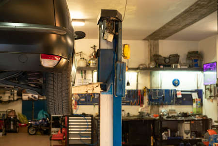 Car in a garage for maintenance, oil/tyre change (shallow DOF; color toned image)