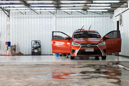 Bangkok, Thailand - January 12, 2020 : Unidentified car care staff cleaning (clean, wash, polish, wax and glass coating) the car (Car detailing) at car care shop in Bangkok Thailand