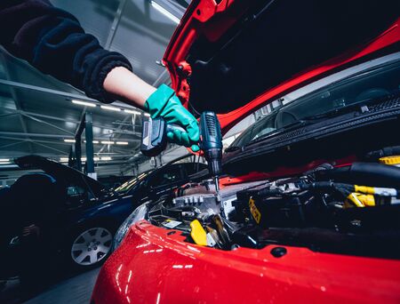 Car master auto mechanic repairer service technician checks and repairs the engine condition under the hood of the vehicle service shop