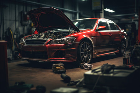 Red car with the hood open in a dimly lit garage, surrounded by tools and car parts. Car maintenance in auto repair shop