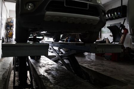 Close-up on lifted automobile held for annual engineering checkup and damage fix. Machine repair workers laboring in modern service station. Blurred background