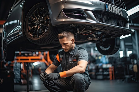 Professional mechanic working under a car placed on a hydraulic lift, adjusting and tightening bolts with precision in a modern auto repair shop