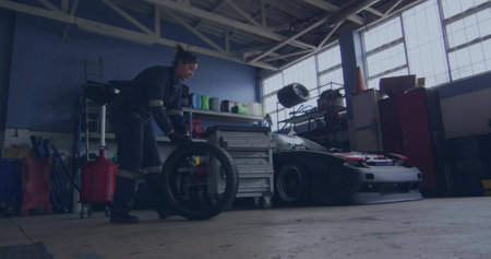 Bending female mechanic in dark coveralls handling spare tire by sports car at workshop, copy space. Garage, technician, industrial, gritty, wheel, toolbox, maintenance